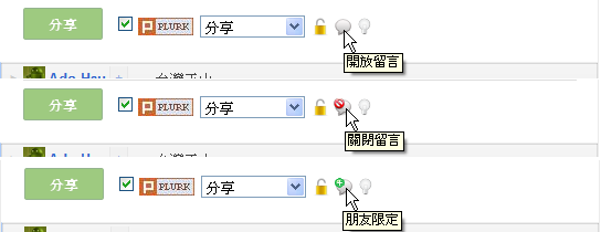 Plus Plurk 一開始預設的 Plurk 訊息是可在河道上自由被檢視及回噗的,但是人生總有些訊息並不想如此大方的公開或是讓人家插花回覆的,有一些開關可以應付這方面的需求。