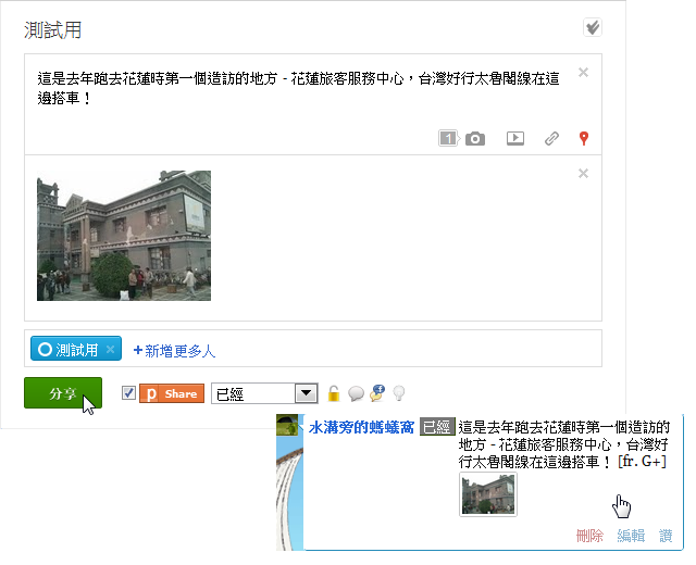 完成安裝後套件會自動將相關程式載入 Google Plus 頁面中,不過您也可以重新載入 Google Plus 頁面,確保相關程式正確的嵌入 Google Plus。只要相關程式已正確嵌入,那麼在輸入訊息時會在分享鈕右側看到多出一個 Plurk Share 圖示。但是因為目前還沒有取得 Plurk 服務授權,所以此刻暫時無法點選。如附圖: